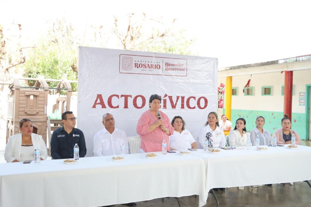 En representación de la presidenta municipal de Rosario, Claudia Liliana Valdez Aguilar, asistió la Secretaria del Ayuntamiento, Ignacia Mailen Delgado Rendón, quien encabezó a la comunidad educativa durante el acto cívico y refrendó el compromiso del gobierno con el fortalecimiento de la educación y el bienestar de los planteles escolares del municipio.