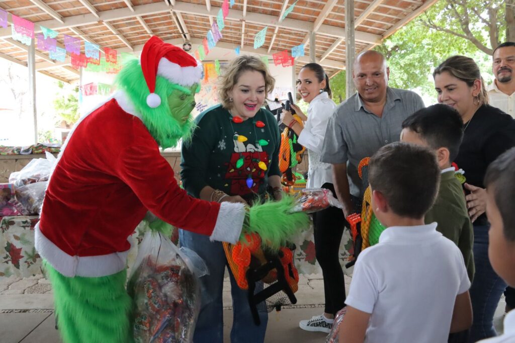 En una divertida convivencia los alumnos disfrutaron del show de Grinch, recibieron juguetes, dulces, lonches y actividades recreativas, así como a sus familias se les entregaron apoyos invernales como cobijas.