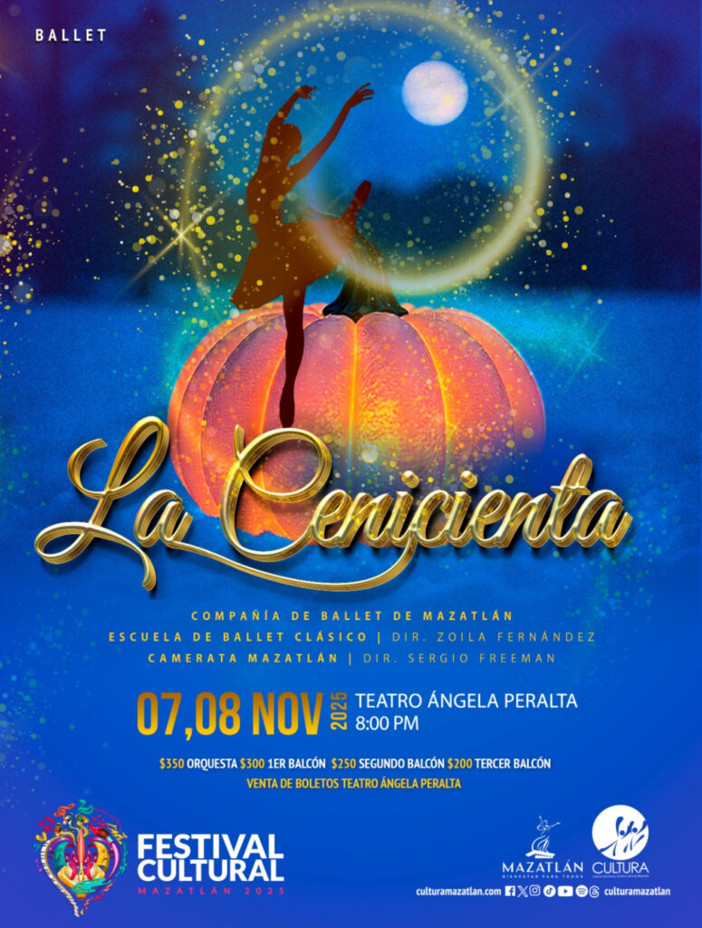 El Festival Cultural Mazatlán 2025 presenta una de las obras más entrañables del repertorio clásico, La Cenicienta, un ballet en tres actos con música en vivo que cobrará vida en el majestuoso escenario del Teatro Ángela Peralta. La cita es el viernes 7 y sábado 8 de Noviembre a las 20:00 horas.