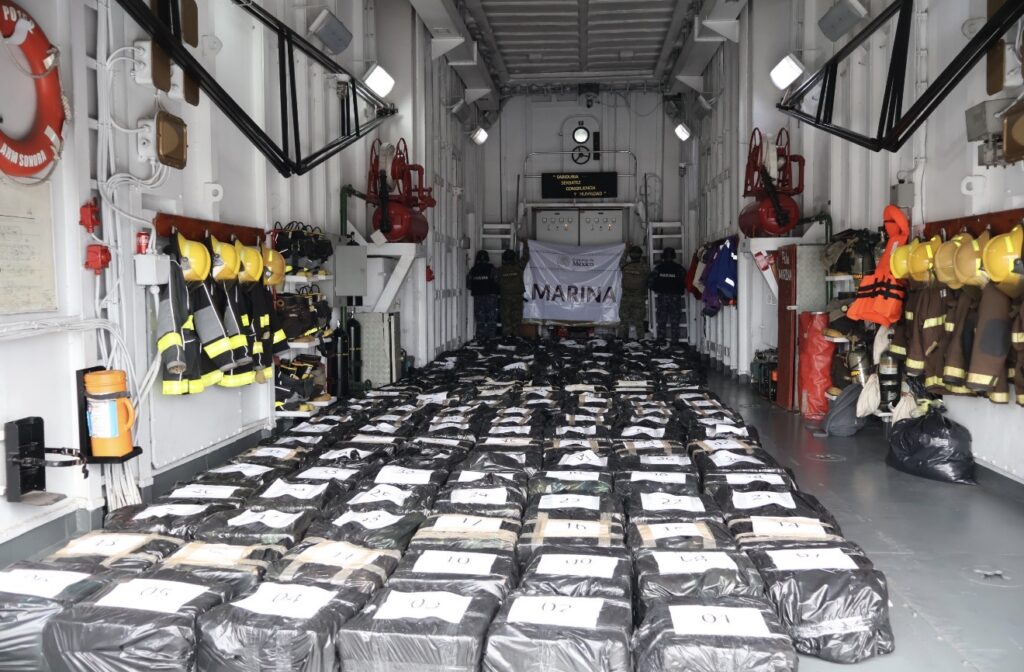 La Secretaría de Marina a través de la Armada de México en funciones de Guardia Costera, informa que, durante operaciones de vigilancia y seguridad marítima, se logró el aseguramiento de aproximadamente 188 bultos que representan varias toneladas de presunta cocaína, en espera de que las autoridades competentes determinen el peso ministerial.