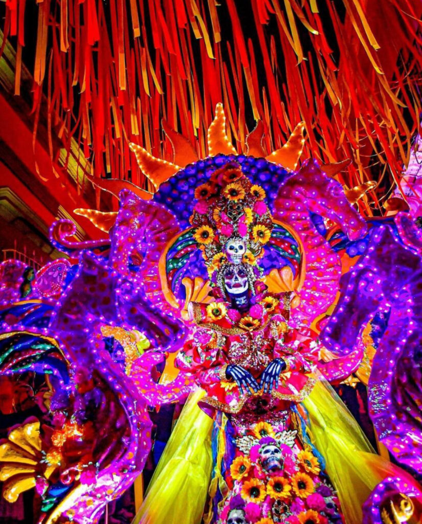 La callejoneada contará con alegres comparsas, espectáculos de lanzafuegos, música envolvente y los icónicos personajes de ultratumba. El recorrido será encabezado por la espectacular Catrina, creación única del artista mazatleco Luis Antonio Ríos, conocido como “El Momo”. Sus obras han trascendido fronteras y serán admiradas en Tokio, Japón del 31 de octubre al 30 de noviembre.