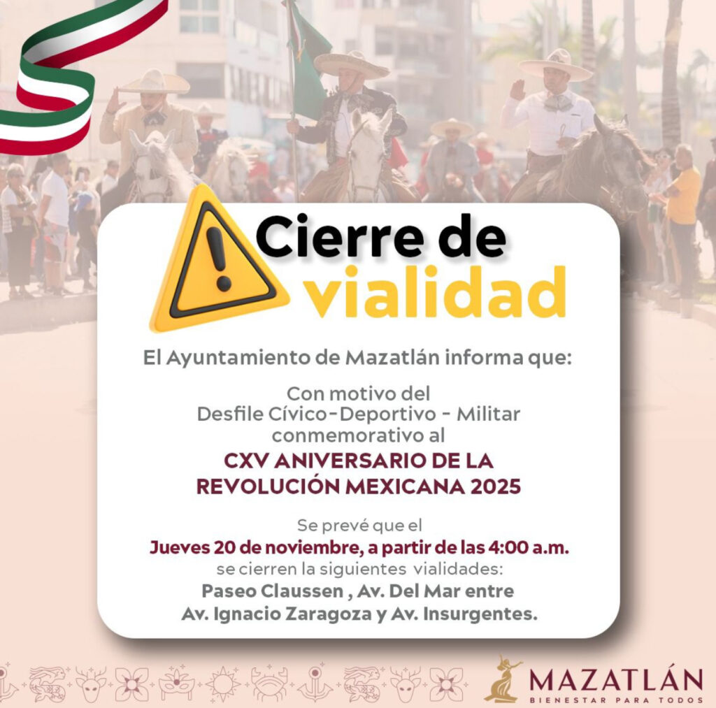 Por desfile cívico, militar y deportivo que conmemora el 115 aniversario del inicio de la Revolución Mexicana, la Secretaría de Seguridad Pública Municipal, a través de la Unidad de Vialidad y Tránsito, informa sobre el cierre de vialidades programado para este jueves 20 de noviembre, con el fin de garantizar un recorrido libre y seguro para los participantes.