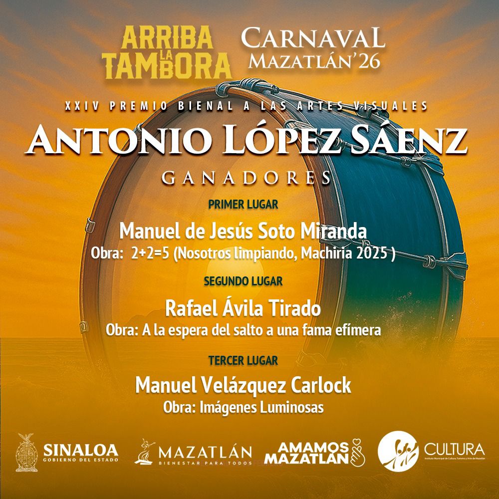 LOCAL. En una celebración que exalta la creatividad y el discurso visual contemporáneo, este lunes se dan conocer los resultados de la XXIV Edición del Premio Bienal a las Artes Visuales Antonio López Sáenz. El certamen, convocado por el Instituto Municipal de Cultura, Turismo y Arte de Mazatlán, en el marco del Carnaval, se ha consolidado como uno de los pilares para la promoción artística en el Noroeste de México.